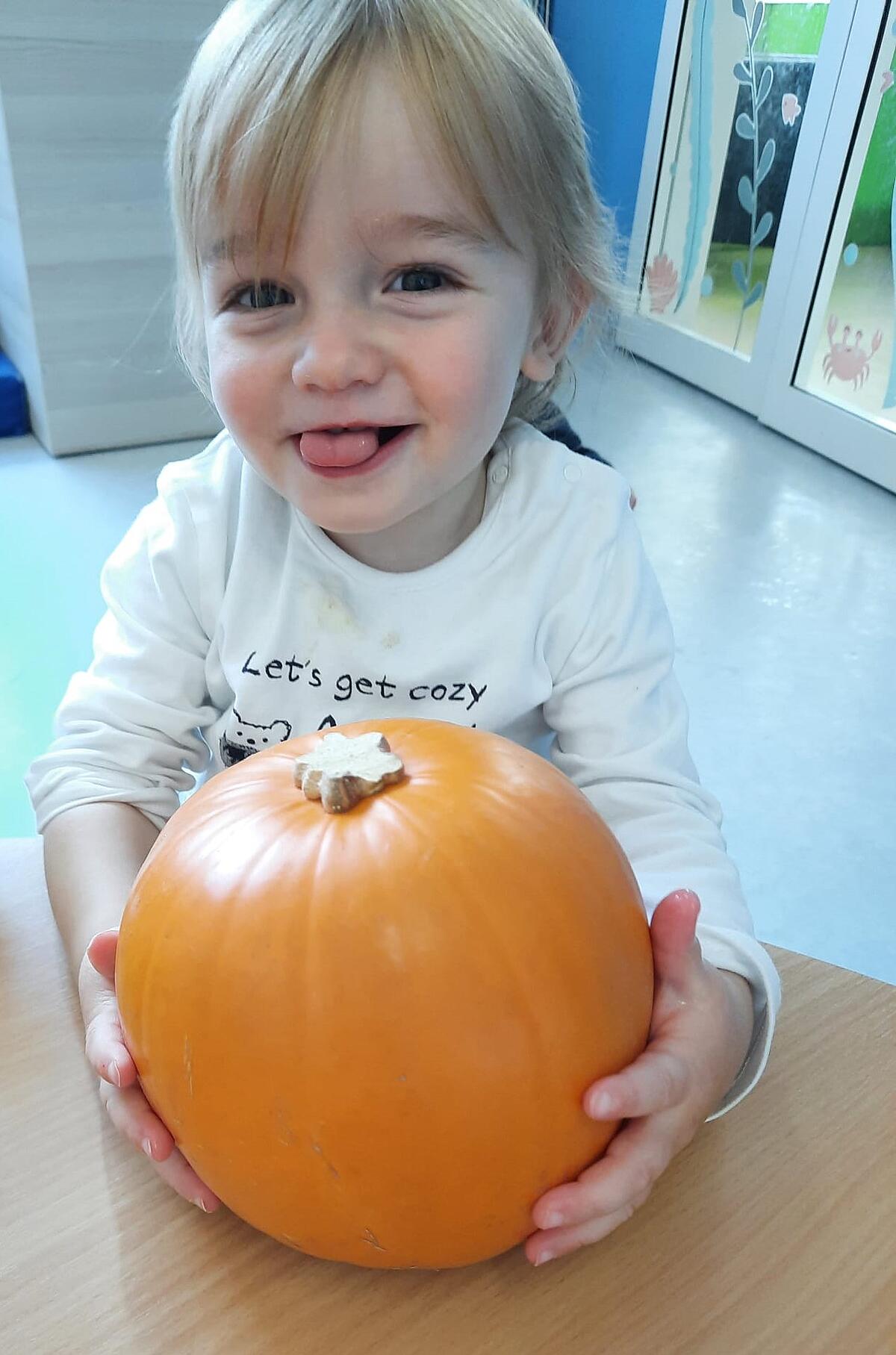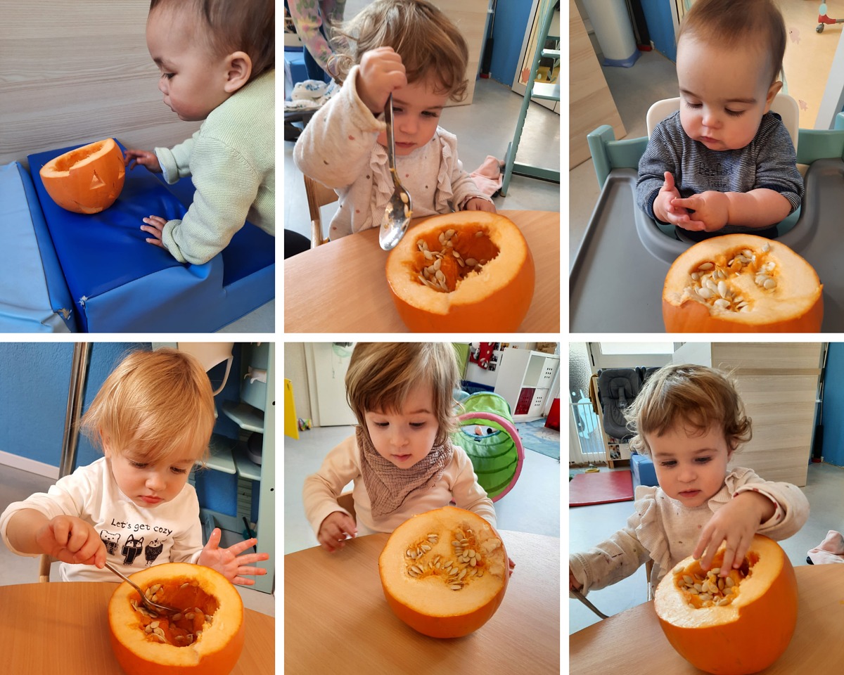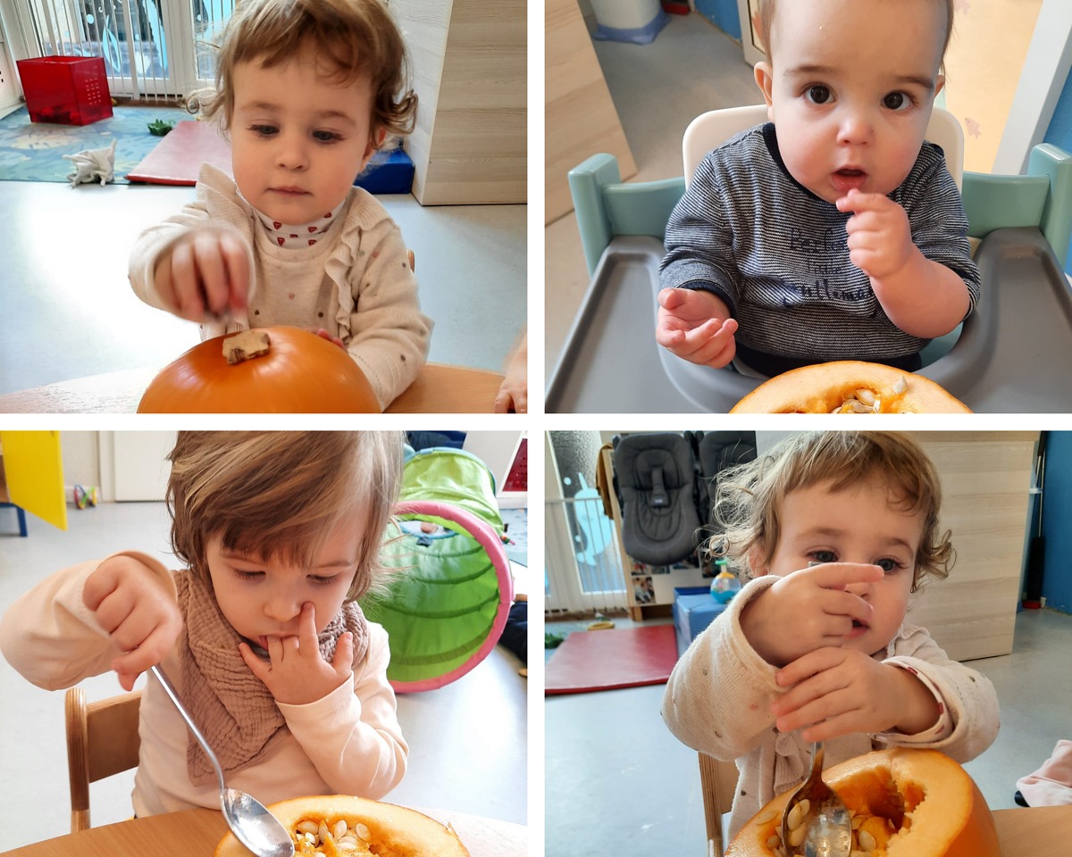 Les Minis-Trotteurs ont pu la toucher, la sentir et creuser l’intérieur de ce gros légume. Et pour finir, ce vendredi, ils ont profité du goûter pour la déguster sous forme de gâteau à la courge!