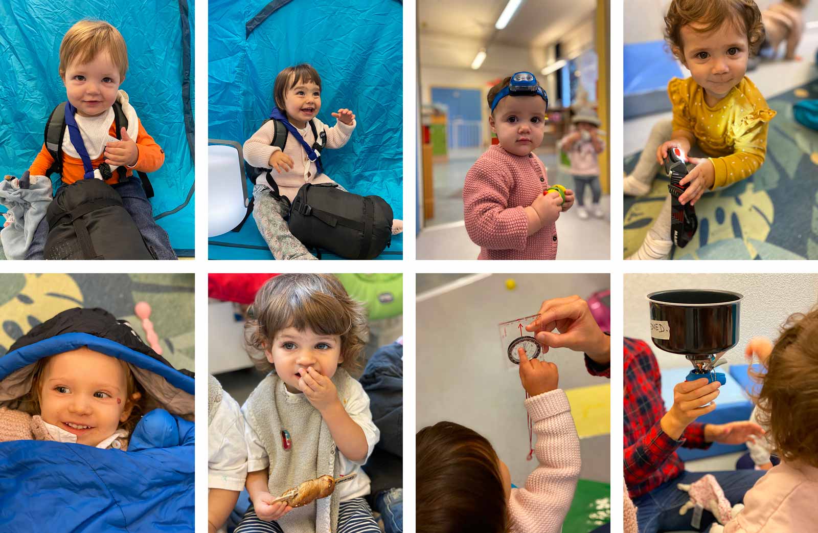 Tout au long de la journée, ils ont pu découvrir les ustensiles du parfait campeur, notamment une boussole, des lampes frontales, une couverture de survie et un sac de couchage, sans oublier un réchaud et une casserole que les parents nous avaient apporté pour l’occasion. Cette journée hors des sentiers battus leur a donné un avant-goût des journées en forêt organisées à la crèche pour les plus grands ou des futures vacances au camping.