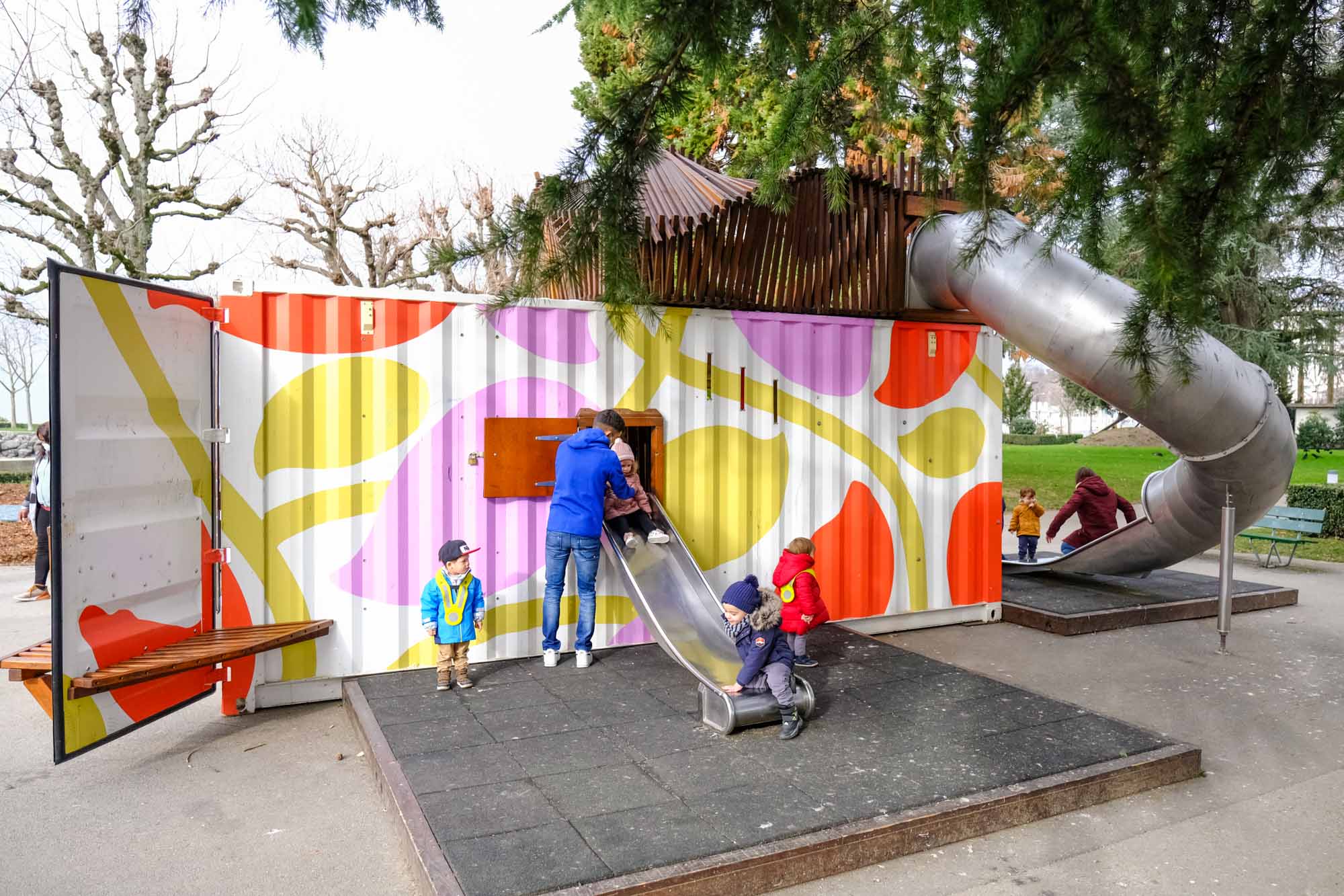Mise à disposition par la Ville de Lausanne, l’Akabane se déplace au gré de ses envies dans les quartiers de la capitale olympique. Nos 11 évaluateur·rice·s de Bon à jouer ont saisi l’occasion de son installation au Jardin Dapples à Ouchy pour aller tester cette place de jeux un peu particulière.